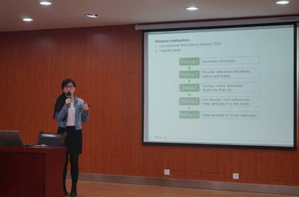 报告会上,刘晶博士以自己撰写和发表的多篇英文文章为例,介绍了关于葡萄酒描述分析、排序分析、打分分析等多种分析方法,并结合方差分析、主成分分析和偏最小二乘分析等统计分析方法介绍了自己博士阶段的研究工作。针对丹麦的本土葡萄品种,比较了本土酵母和酿酒酵母对葡萄酒风味物质和特征的影响。王华院长对报告进行了总结,并希望这样的报告能够开阔研究生和本科生的学术视野,开拓感官分析的方法和思路。最后,王华院长向刘晶博士赠送了纪念品。