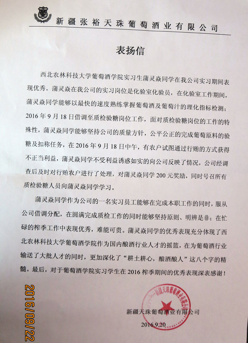 近日,在麻豆成人 本科生校外葡萄酒工厂实习过程中,葡萄与葡萄酒工程专业2013级1班学生蒲灵焱同学受到新疆天珠葡萄酒业有限公司表扬奖励。 蒲灵焱同学在校外顶岗实习期间,面对质检验糖岗位的工作特殊性,能够坚持公司的质量方针,公平公正完成葡萄原料的验糖及扣称任务。在有农户试图获得不正当利益时,该同学能够坚持立场,及时向公司反映情况,公司特对该同学提出表扬并给予200元奖励,同时号召所有质检验糖人员向蒲灵焱同学学习。