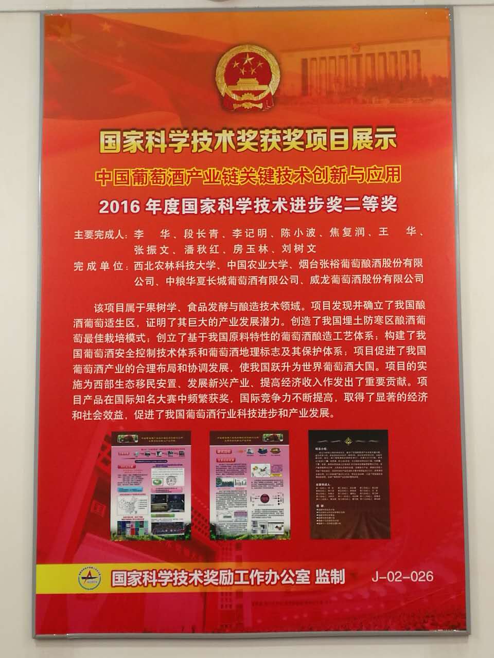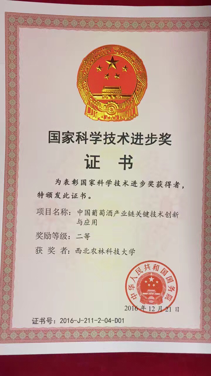 李华教授主持完成的“中国葡萄酒产业链关键技术创新与应用”荣获2016年度国家科技进步二等奖。