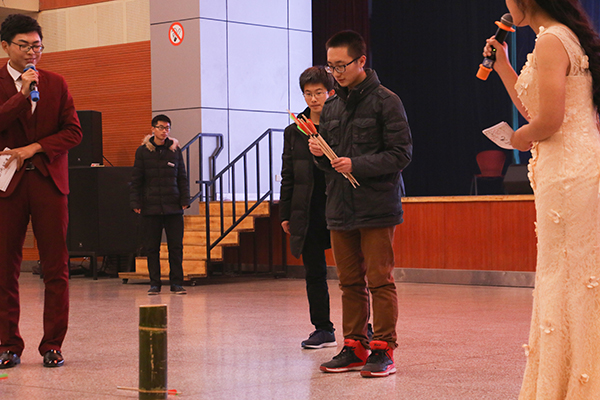 伴着古风舞蹈《粉墨》,主持人介绍了与会嘉宾和赞助商,宣布新年酒会正式开始。宝髻瑶簪。严妆巧,天然绿媚红深。由身着汉服的侍酒师展示晚会所用酒款,主持人宣布开第一款酒。在享用第一款酒的同时,赞助商和与会人员做起了互动,以有奖提问的方式,渲染了酒会愉悦的气氛。在唯美的古筝演奏《月儿高》一曲作罢,我们迎来的是和本次酒会一样主题的朗诵--酒淌时光,从唐诗到宋词,从元明曲到现代诗,携美酒,穿古今,赏葡萄。接下来时光转眼到了近代,歌曲串烧用“夜上海“,”给我一个吻“等老歌,带大家一起走入二十世纪风情。岁月如梭,一首清新的“吉姆餐厅“带我们来到现代沉醉;拉丁舞串烧用斗牛、伦巴、牛仔、恰恰共同演绎,引爆全场;一把吉他,他轻声弹唱,一个故事,他用歌声诉说,月亮代表我的心。在品尝美酒,观赏节目的同时,酒会还进行了多项有趣的游戏互动, 如“谁是卧底”“汉宫投壶”“蒙眼作画”等,其中最引人注目的莫过于“汉宫投壶”这一古时酒宴游戏,大家都跃跃欲试,热情满满,乐在其中还发起了“酒淌时光”的微博话题讨论,并利用微博墙抽取幸运观众,为他们送上由美酒。现场葡萄酒爱好者鱼贯其中,举杯交流,整个酒会呈现出轻松愉快的欢畅氛围。