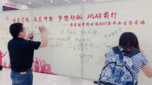 、感念师恩、梦想起航、砥砺前行”为主题的欢送毕业生签名墙,同学们的感恩之情和老师们的美好祝愿,都化作了签名墙上动情的话语。“甲贵爸爸”、“和财爷爷”、“继红妈咪”这样的昵称,体现了学生对老师的认可和爱戴,“感谢全院老师的栽培,么么哒!”、“牢记教诲,老师保重!”、“出航四海,麻豆成人
