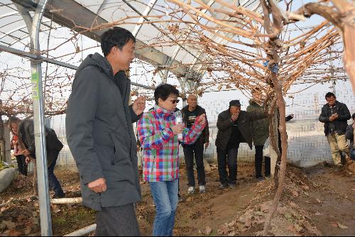 15日下午,王华教授和培训学员首先来到了临渭区故市镇三畛村周金玉家的避雨栽培的阳光玫瑰大田中进行了现场观摩,王华教授就品种更换以及高接换头等技术要点进行了现场讲解。然后来到吝店镇永乐村王志文的紫甜无核葡萄地中,王志文详细地介绍了紫甜无核这个鲜食葡萄品种在陕西渭南地区所表现的优劣势。随后又来到渭北葡萄产业园的三贤友邦合作社,现场观摩了葡萄枝条粉碎以及农业生态循环等新技术。最后来到下邽镇柳园村的临渭区葡萄研究所,由王录俊所长就近几年在研究所试验田中进行的品种选择、架型培养、采后管理等葡萄栽培过程中的关键技术的实验结果,对学员进行了一一介绍。