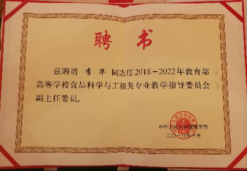 李华教授连任食品教指委委员并受聘新一届食品科学与工程专业教指委副主任委员。