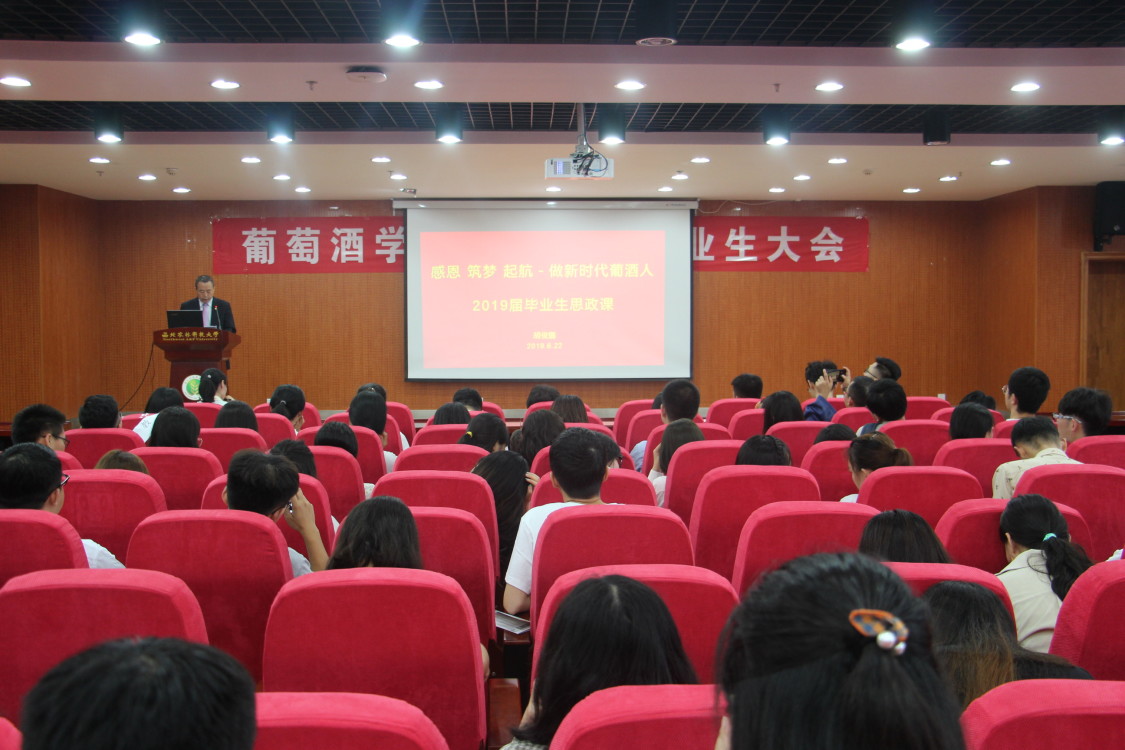 党委书记胡俊鹏给2019届毕业生讲授了一堂主题为“感恩、筑梦、启航——做新时代的葡酒人”的思政课。